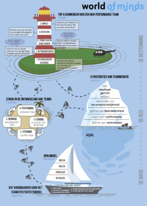 Om die context in één oogopslag te kunnen bespreken, gebruiken we de metafoor van een teamontwikkelreis als zeilreis en hebben daar een visual van gemaakt (die je als poster kan printen om makkelijker met je team te bespreken). In die poster komen inzichten uit teamonderzoek en systeemdenken samen. Je kunt deze teamzeilreis-poster via de link bekijken en downloaden: teamreis