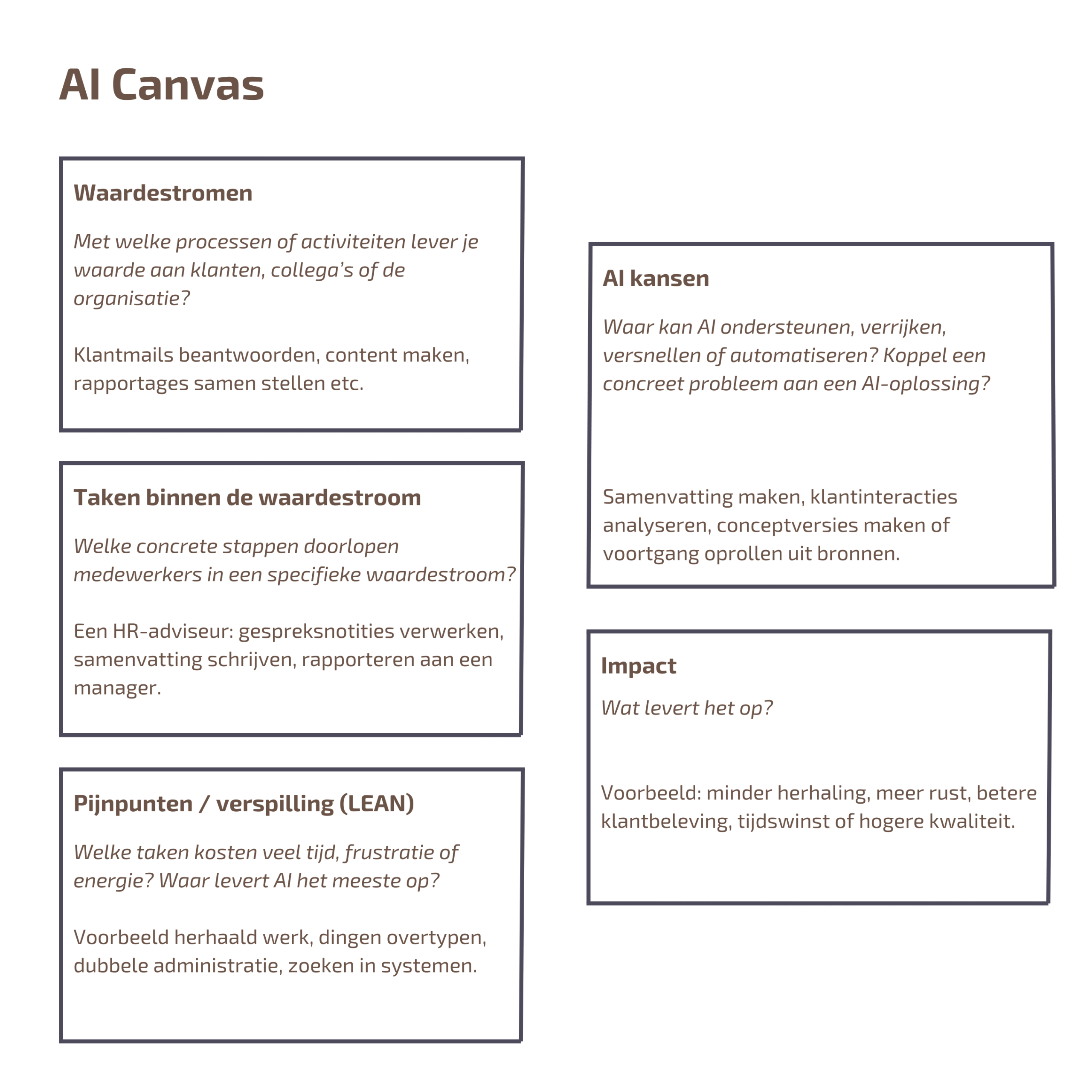 | 4. AI kansen | Vraag: Waar kan AI ondersteunen, verrijken, versnellen of automatiseren? Je koppelt hier concreet een probleem aan een AI-oplossing. Voorbeeld: Samenvattingen maken, klantinteracties analyseren, conceptversies maken of voortgang oprollen uit bronnen. |