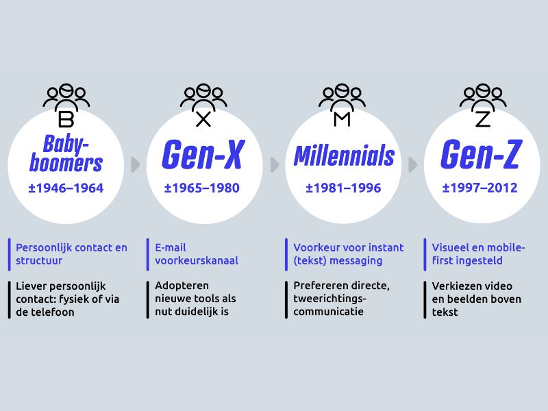 - Babyboomers (±1946–1964): waarderen persoonlijk contact en structuur. Zij verkiezen voor belangrijke zaken vaak de telefoon of een fysiek gesprek boven digitale alternatieven.