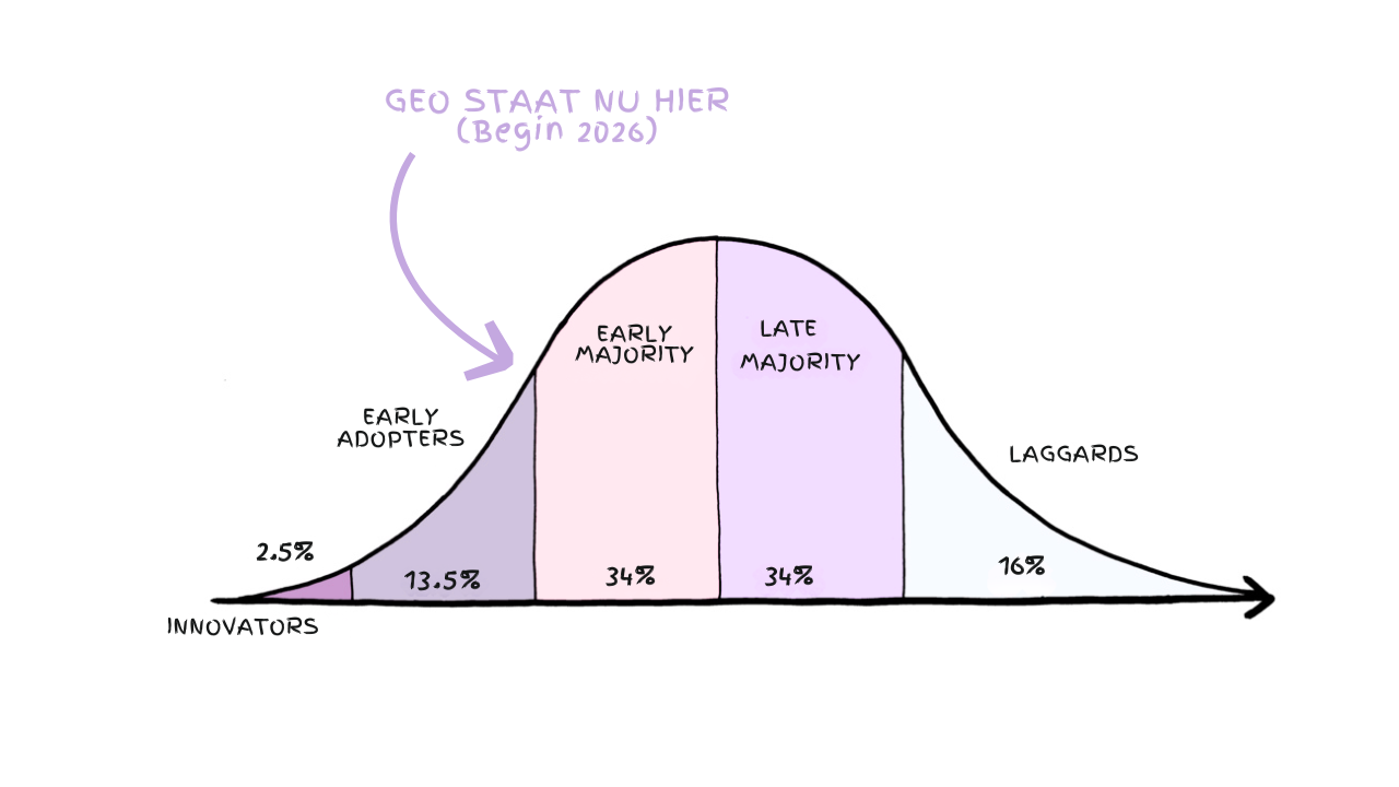 De ontwikkelingen staan niet stil. Als we kijken naar Everett Rogers’ beroemde diffusion of innovation-curve, dan bevinden we ons nu in de transitie van ‘early adopters’ naar ‘early majority’. De innovators en durvers hebben GEO al omarmd.