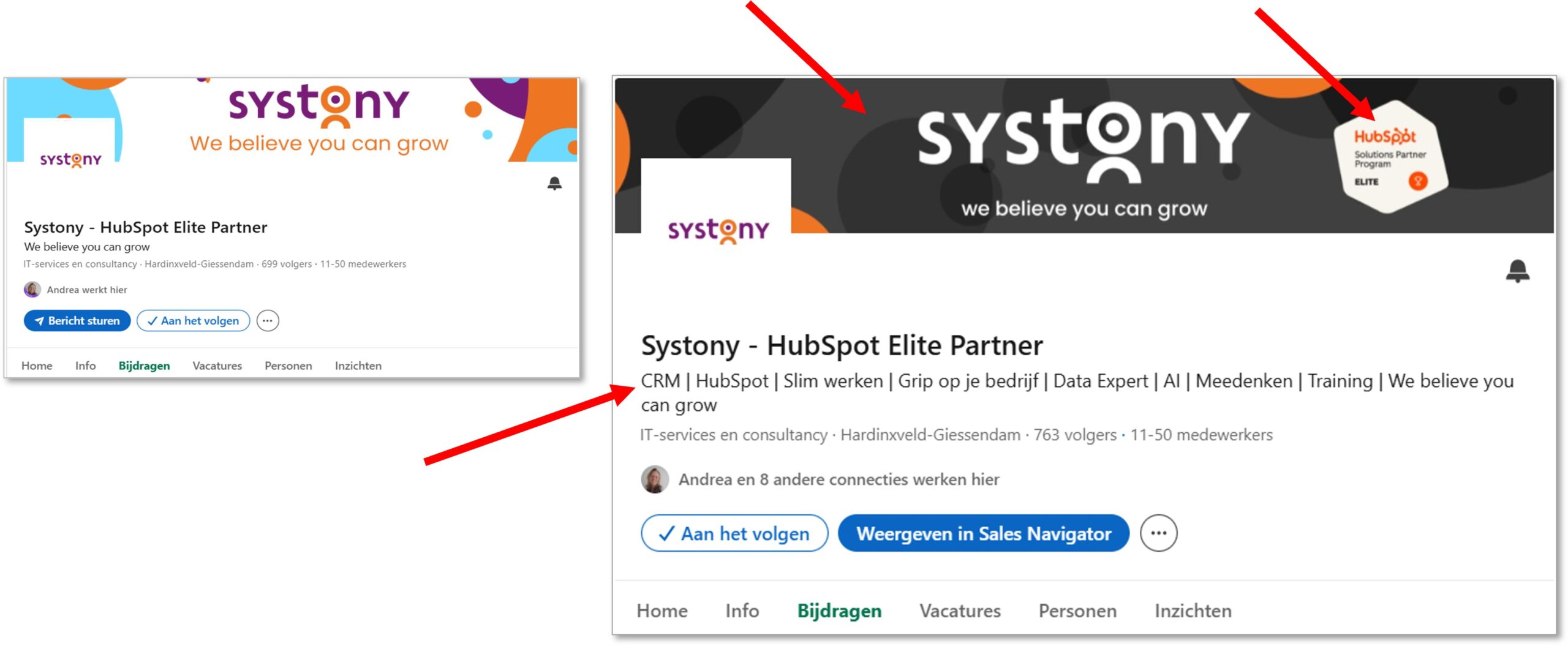 - De kopregel van Systony is duidelijker met toevoeging van keywords bij de slogan ‘We believe you can grow’.