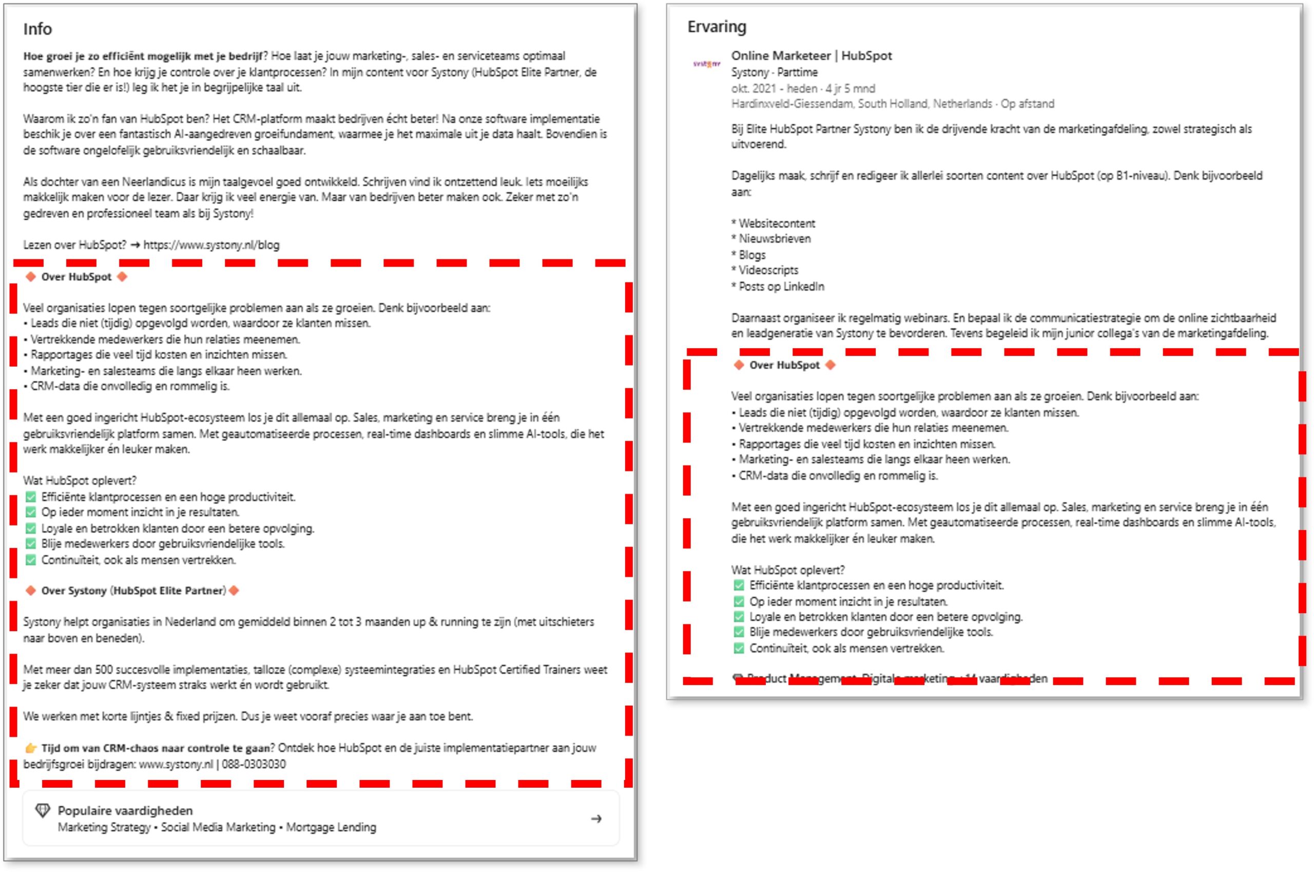 Vraag collega’s deze zorgvuldig opgestelde tekst te kopiëren naar hun eigen profiel bij ‘info’ en ‘ervaring’. Dan staat de basis en kunnen ze het zelf aanvullen.