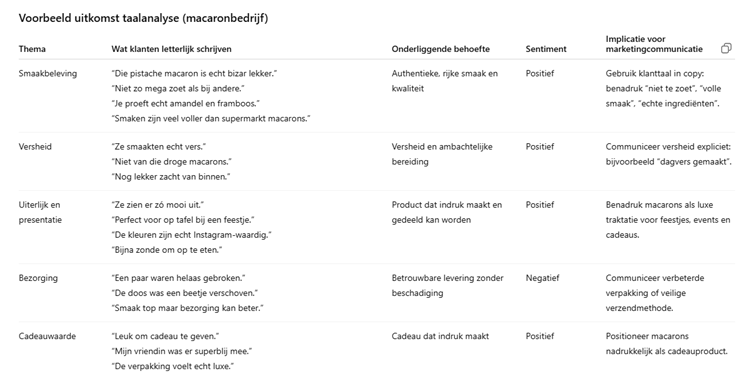 Om je een voorbeeld te geven van wat er uit zo’n prompt kan komen, dook ik mijn eigen fantasiewereld in: ik verkoop macarons. Afgelopen week heb ik de communicatie van en met mijn klanten verzameld en anoniem gedeeld met AI. Dan is dit een voorbeeld van de inzichten uit een taalanalyse: