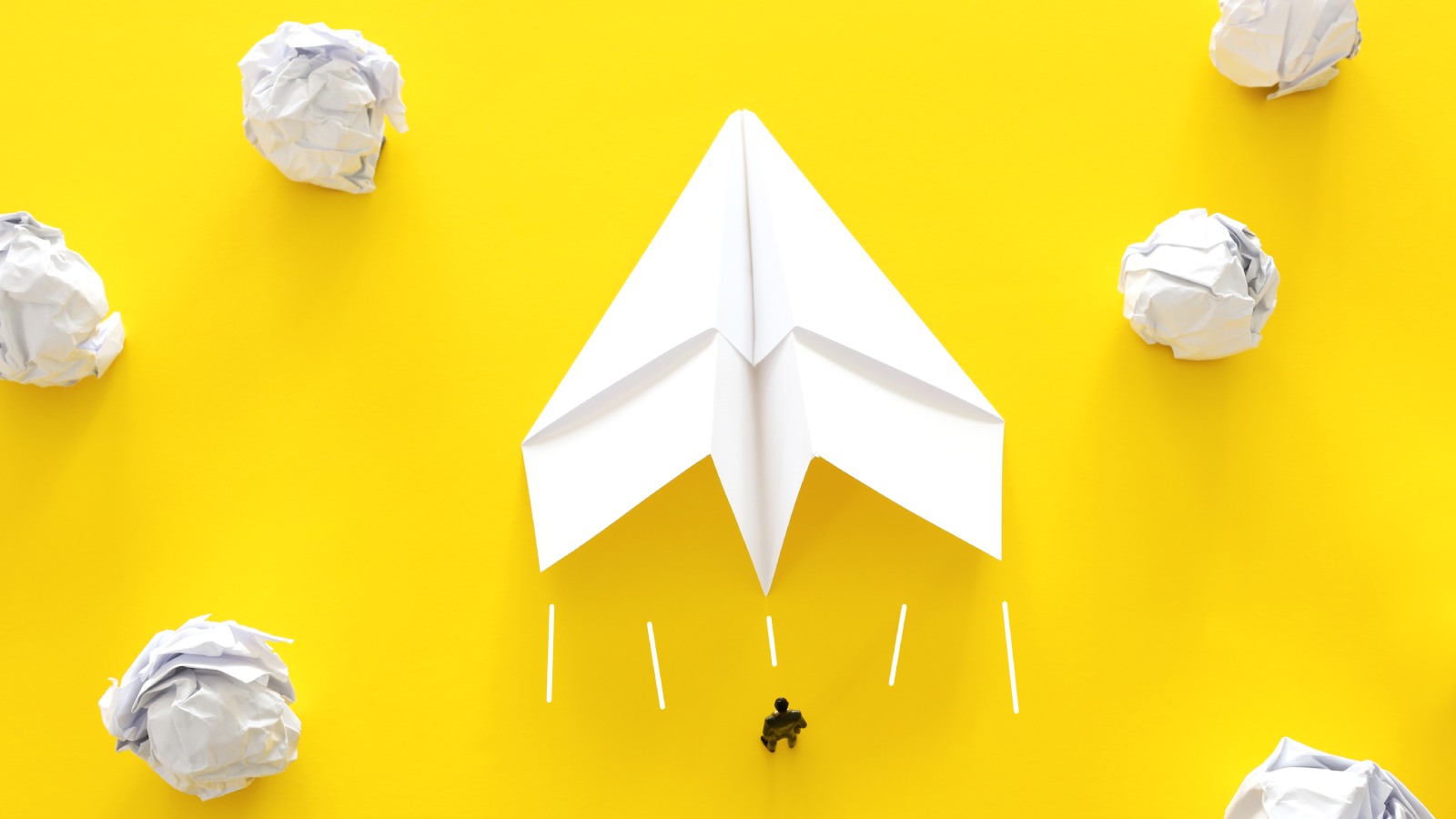 Samantha geeft handvatten over hoe je vanuit terugkerende vragen kunt werken, rondom duidelijke thema’s bouwt en hoe je je website als centraal punt maakt. Kijk niet naar wie het meest publiceert, maar wie het meest raakt.Proppen papier en papieren vliegtuig op gele achtergrond ter illustratie van contentoverload veranderen in duurzame online zichtbaarheid en content