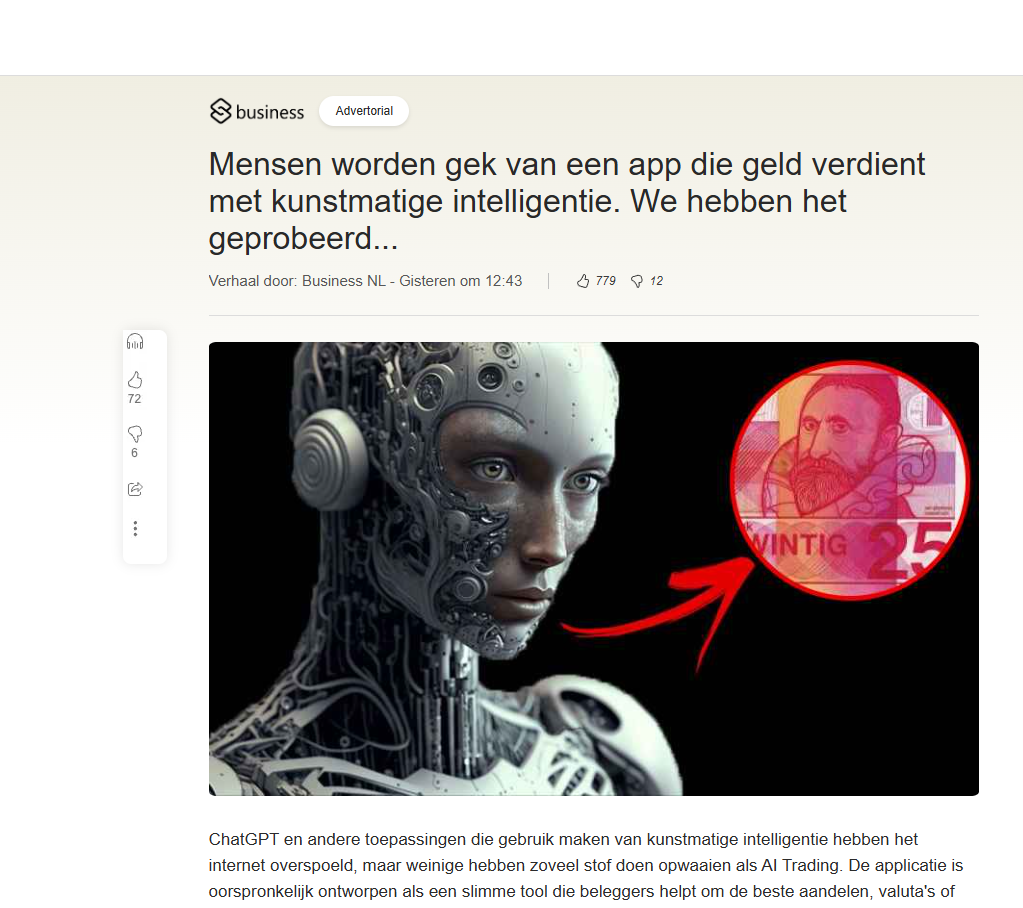 Tijdens het lezen van een artikel op NU.nl viel mijn oog laatst op een display-advertentie. De belofte: een gloednieuw AI-tradingsysteem waarmee je geld kan verdienen. Als nuchtere Fries was ik direct een beetje sceptisch. Je wordt tenslotte niet voor niets regelmatig gewaarschuwd voor dit soort advertenties. Meestal zitten hier fraudeurs achter die erop uit zijn om jou en je zuurverdiende spaargeld zo efficiënt mogelijk van elkaar scheiden.