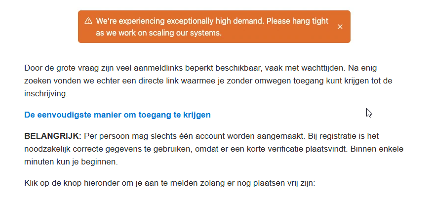 We scrollen verder. Ongeveer halverwege de pagina duikt er nog iets op: een screenshot van wat een pushmelding vanuit het platform moet voorstellen. Er is blijkbaar veel vraag en als je wilt meedoen, moet je je snel aanmelden. Opschieten dus.