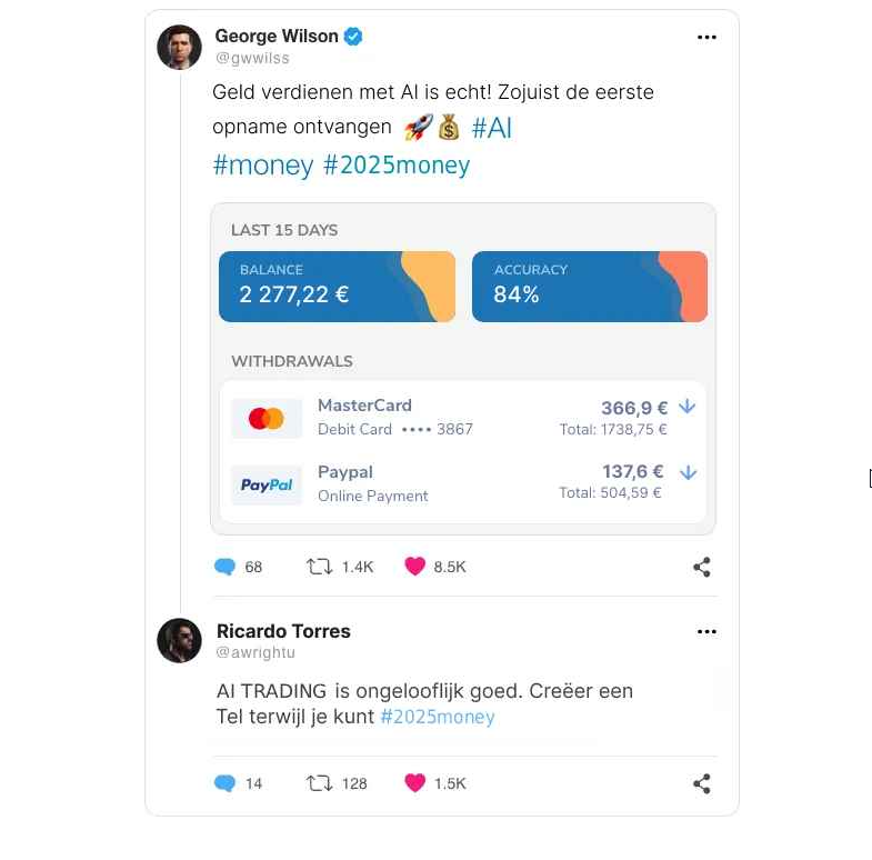 Het autoriteitsprincipe is nog maar het begin. Scroll je iets verder naar beneden, dan kom je een screenshot tegen van een gesprek op X. Twee (fictieve) personen praten enthousiast over het AI-tradingplatform. De boodschap is duidelijk: ze hebben het geprobeerd en flink geld verdiend. De engagement-cijfers onder de posts zijn ook niet mals. Likes, reacties, reposts. Alles om het geloofwaardig te laten lijken. De impliciete boodschap is: ‘Geloof ons niet. Geloof onze klanten’.