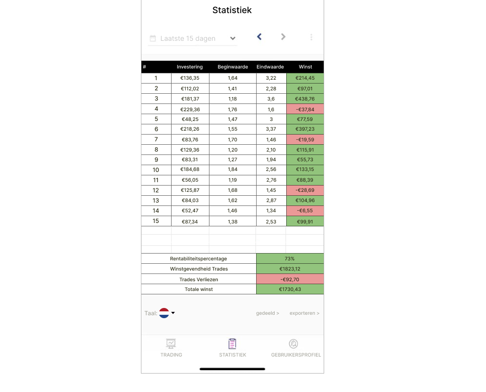 Verder naar beneden op de pagina vinden we nog een interessant element: een overzicht van de fictief behaalde resultaten in 15 dagen. Je voelt hem waarschijnlijk al aankomen: de teller staat dik in het groen. Als we het plaatje moeten geloven, hoef je dit systeem alleen maar aan te zetten en kun je daarna rustig achterover leunen, terwijl het geld binnenstroomt. Maar de groene plusjes en hoge bedragen zijn niet het slimste onderdeel van deze tactiek.